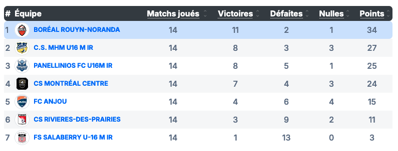 Notre équipe a brillé tout au long de la saison régulière de la Ligue Concordia, se classant solidement en tête du classement avec une belle avance sur ses concurrents. Sur les 14 matchs joués, nous avons remporté 11 victoires, essuyé seulement 2 défaites et concédé un match nul, cumulant ainsi 34 points.